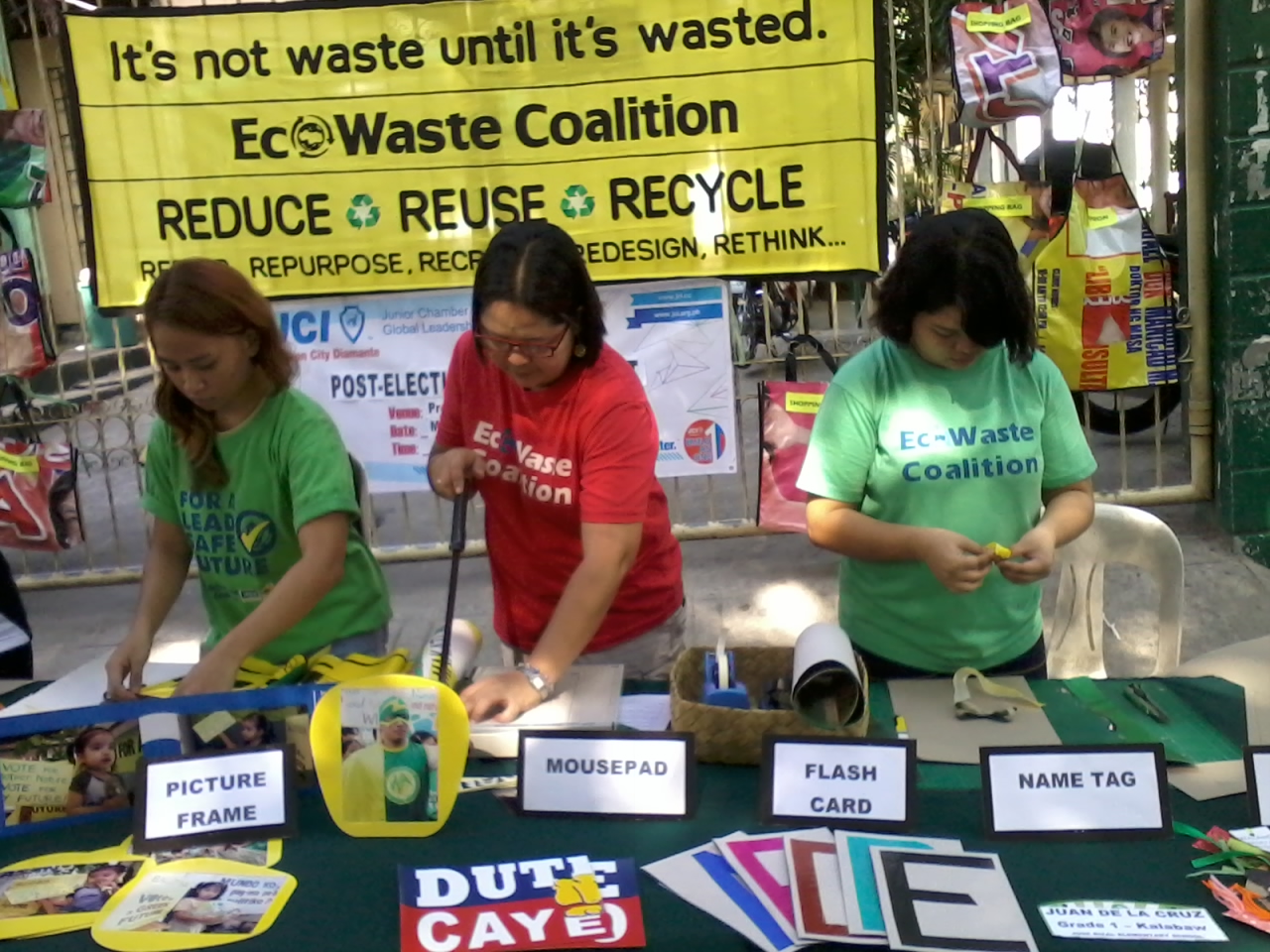 Among the groups that participated in the post-election clean-up and recycling drive were the Barangay Project 6 Council, Office of Mrs. Beth Delarmente, Junior Chamber International-Quezon City (Diamante) and the EcoWaste Coalition Secretariat.